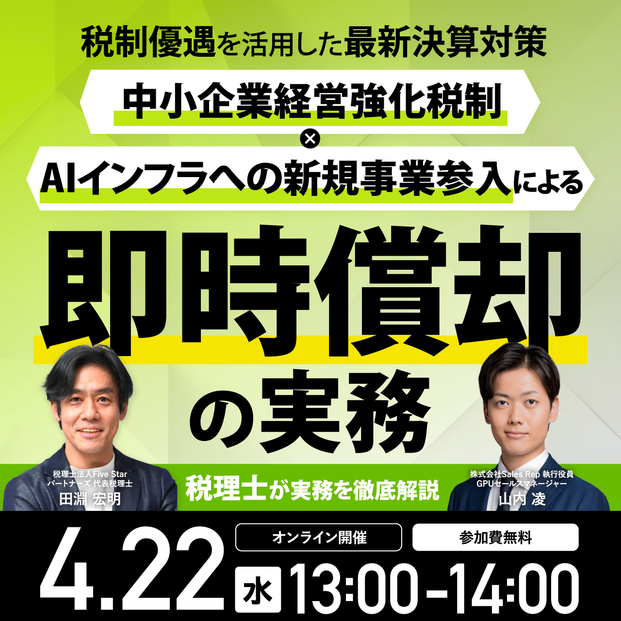 | 内容 | 国の認定制度で初年度一括損金計上が可能に 「GPUサーバー × 中小企業経営強化税制」活用セミナー 生成AIの爆発的成長により、GPUサーバーはただの設備導入ではなく、国が認定する中小企業経営強化税制の活用対象として、税制優遇を活用した新規事業参入を可能とする戦略的資産となりつつあります。 本セミナーでは、3,000万円規模の課税所得が見込まれる企業の経営者様のみを対象に、決算対策を可能とする税制優遇を活用した新規事業参入について、税制の仕組みから、実際の導入手順、活用による財務的インパクトまでを、具体的かつ実務的に解説します。 また、3,000万円超の設備を初年度で一括損金計上できる中小企業経営強化税制の活用法については、実務に精通した税理士より直接ご説明いたします。制度の適用条件や必要書類についても、安心してご理解いただけるよう、わかりやすく解説します。