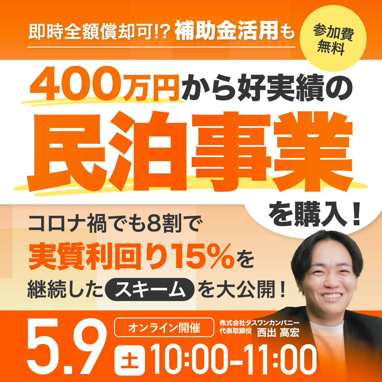 | 内容 | 即時全額償却可!? 補助金活用も。400万円から好実績の民泊事業を購入! コロナ禍でも8割で『実質利回り15%』を継続したスキームを大公開!