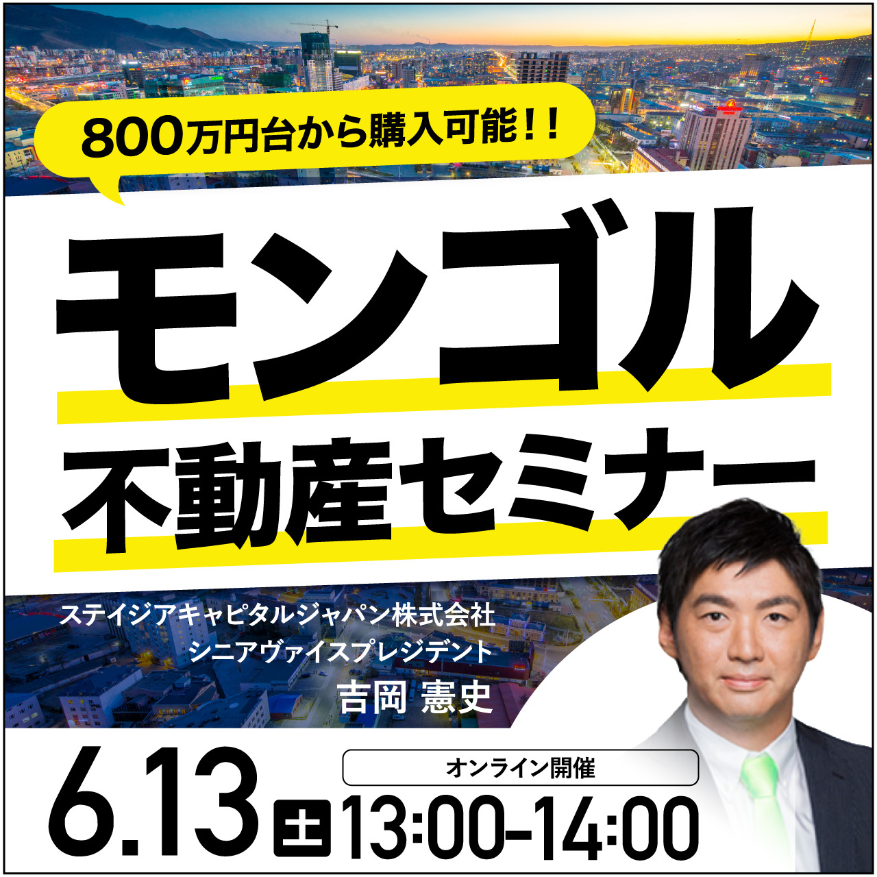 | 内容 | 今回のセミナーは、モンゴルの首都ウランバートルの都心新築物件のご紹介です。