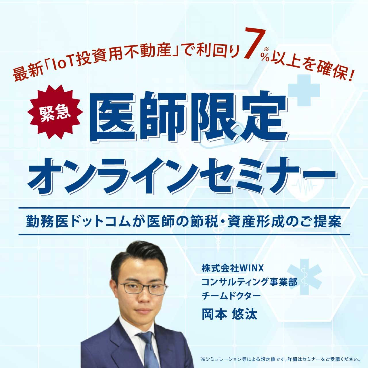 | 内容 | 勤務医ドットコム(株式会社WINX)が【医師限定】緊急オンラインセミナーを開催します。 高所得の医師だからこそ第2の収入源の確保が重要 「年収は高いはずなのに、なぜ貯金ができないのか?」「日本は税金が高いからしょうがない」…、こんなお悩みの医師は多いのではないでしょうか。 ▶高所得の医師の課題 第2の収入を作ることで、将来や万が一のときに備えることができます。保有する資産が生み出す継続的な現金収入。それが不動産投資です。 月20万円以上のプラス収支を確保する「IoT投資用不動産」 【医師限定】医師向けに開発した最新「IoT投資用不動産」をご提案します。 医師に最適な不動産投資案件の秘密。 最寄り駅5分~10分の厳選立地、入居者が喜ぶ人気設備を完備、最新IoT標準搭載で他の物件と徹底した差別化。空室リスクを極限まで減らして、継続的な現金収入を確保する最新「IoT投資用不動産」活用術です。 医師だからできる節税、資産形成を専任コンサルタントが徹底サポートします。 ※詳細はセミナーで説明します。 <こんなドクターにおすすめ> セミナーでは、岡本悠太氏(株式会社WINXコンサルティング事業部)が医師の資産形成・資産活用は不動産投資が最適である理由を詳しく説明します。当日は特別ゲストに登壇いただき、最新「IoT投資用不動産」活用について解説いただく予定です。 <株式会社WINXについて> |