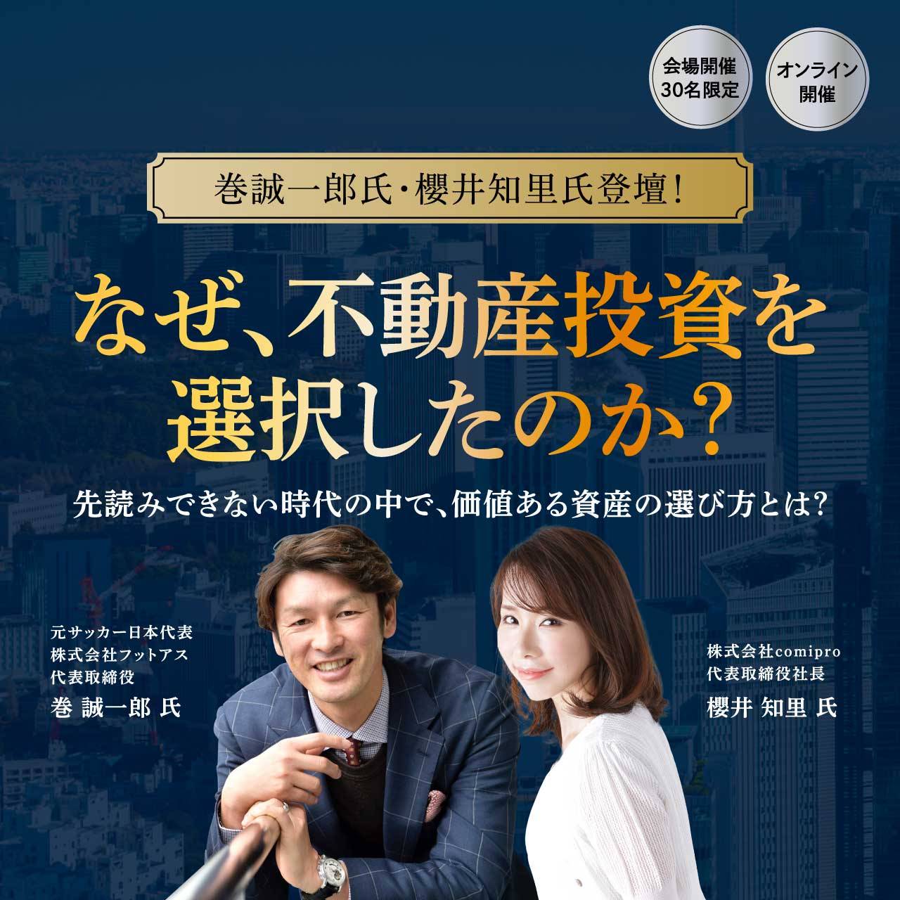 | 内容 | ※ 会場+オンライン 同時開催 ※ 今年3月、2016年から続いたマイナス金利政策の解除が発表されました。 その結果、今後の借入における金利上昇が見込まれ、インフレによる支出増加も続く中、暮らしや企業活動への影響に不安を感じている方も多いのではないでしょうか? この様な背景もあり、資産運用・投資への関心はますます高まり、実際に金融機関やインターネット上では、さまざまな投資商材があふれています。 その中で注目されている一つが希少性の高い「現物資産」です。 本セミナーでは、実際に不動産投資を実践し、コラムなどの執筆活動も行っている元アナウンサーの櫻井氏と、スペシャルゲストとして元サッカー日本代表の巻氏にご登壇いただき、ご自身の経験を交えながら投資についてお話しいただきます。 なお、会場参加の皆様には、セミナー後にGINZA SIXのバスツアーにご参加いただけます。