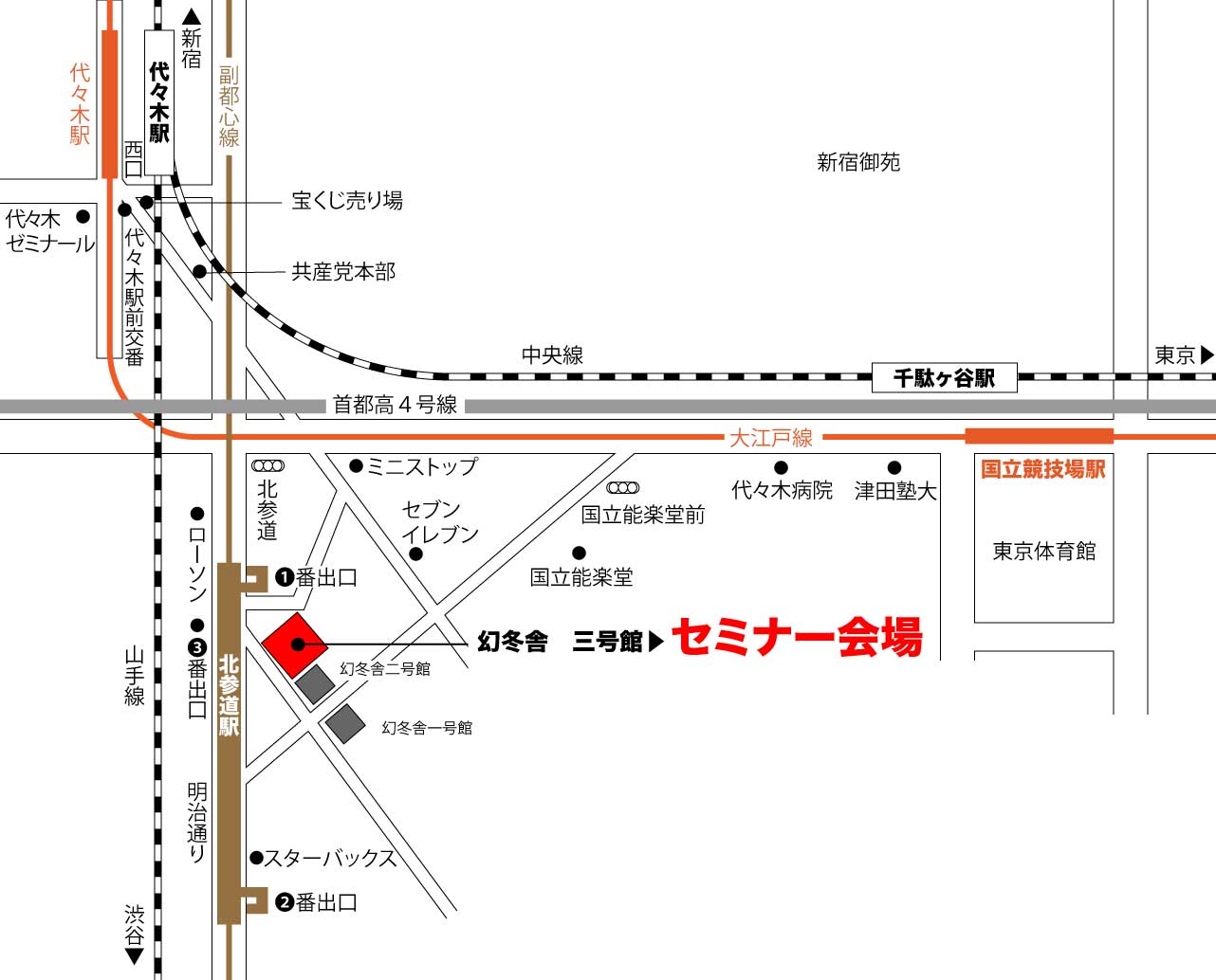 ![]() 東京メトロ北参道駅1番出口から徒歩1分 JR代々木駅・千駄ヶ谷駅から徒歩7分 ※セミナー会場に駐車場のご用意はございません。 公共交通機関のご利用をお願い申し上げます。 ※最寄駅の北参道駅は、副都心線急行電車は停車いたしませんのでご注意ください。 |